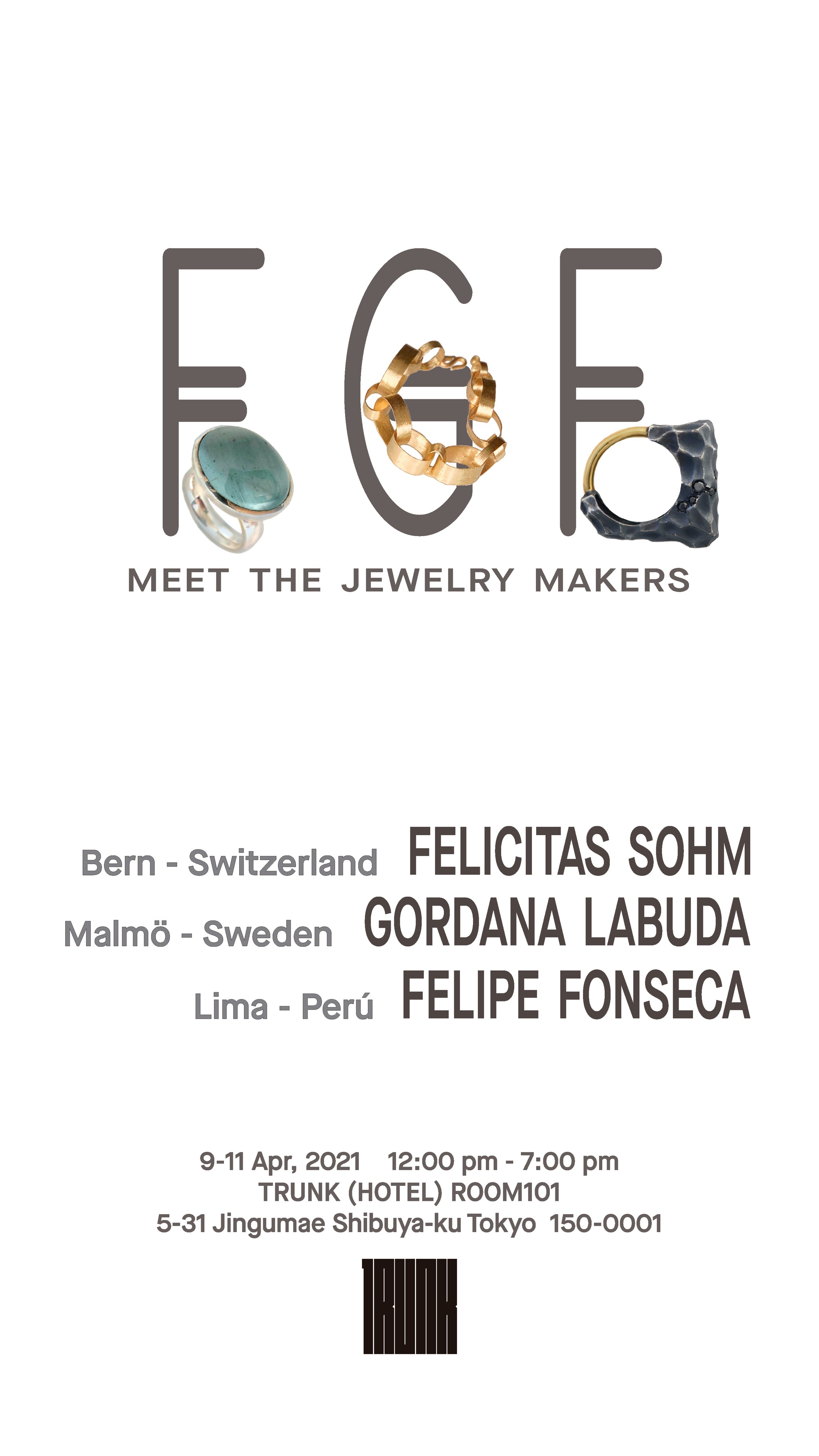 スイス、スウェーデン、ペルー出身のジュエリーアーティストの3名の合同展示会です。直接アーティストと交流しながら三者三様のデザインを楽しんでいただき、その場で予約やオーダーもできますのでぜひ見にいらしてください。