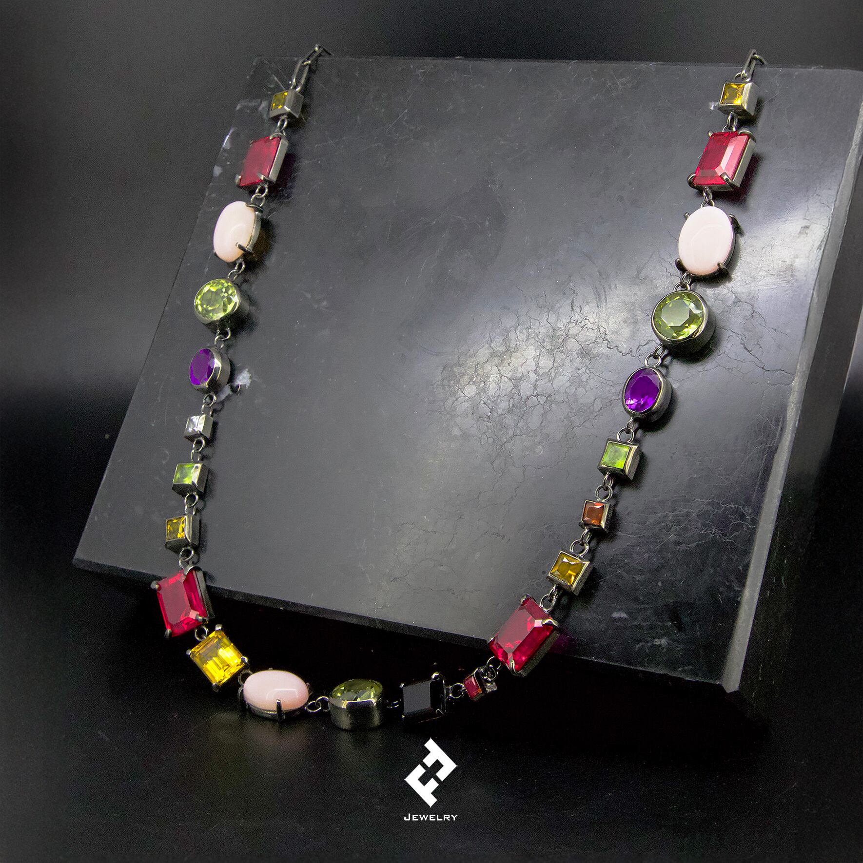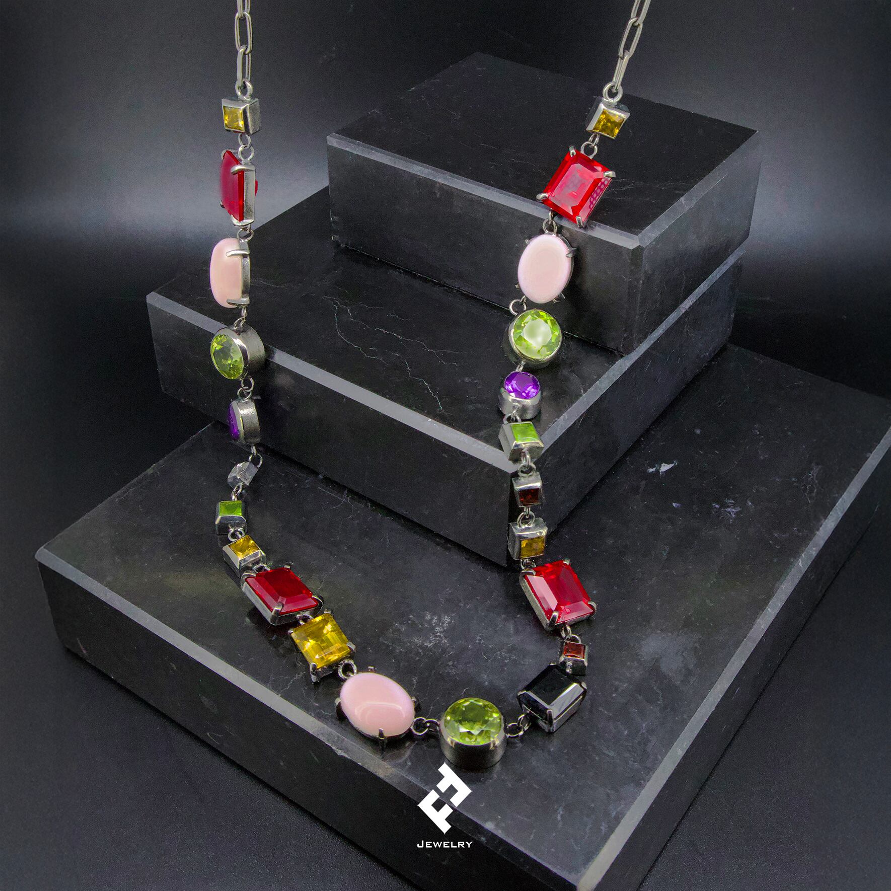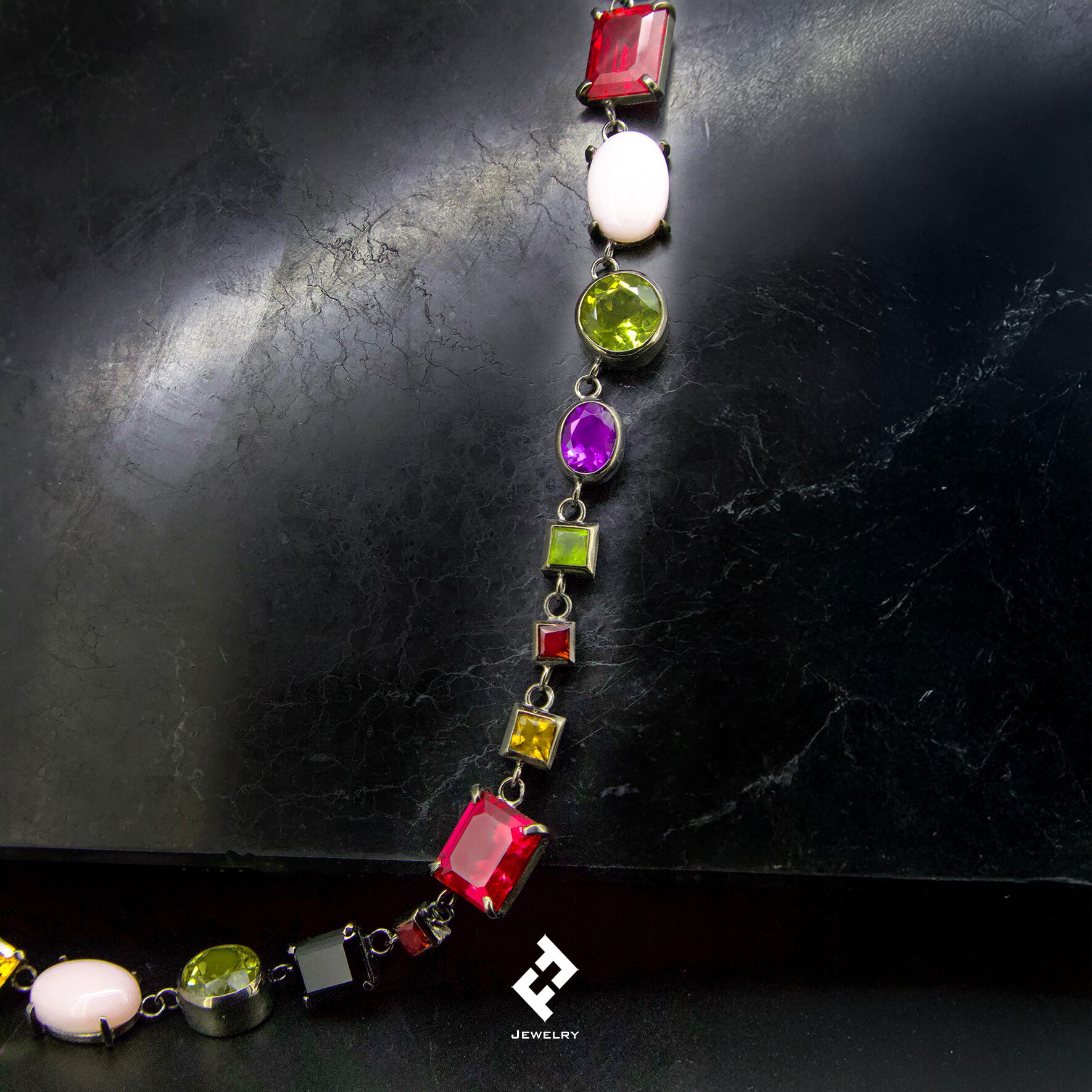 Each stone—amethyst, white topaz, peridot, citrine, lemon quartz, pink opal, garnet, onyx, and synthetic ruby—radiates its own light and energy, evoking ancient secrets and timeless beauty.